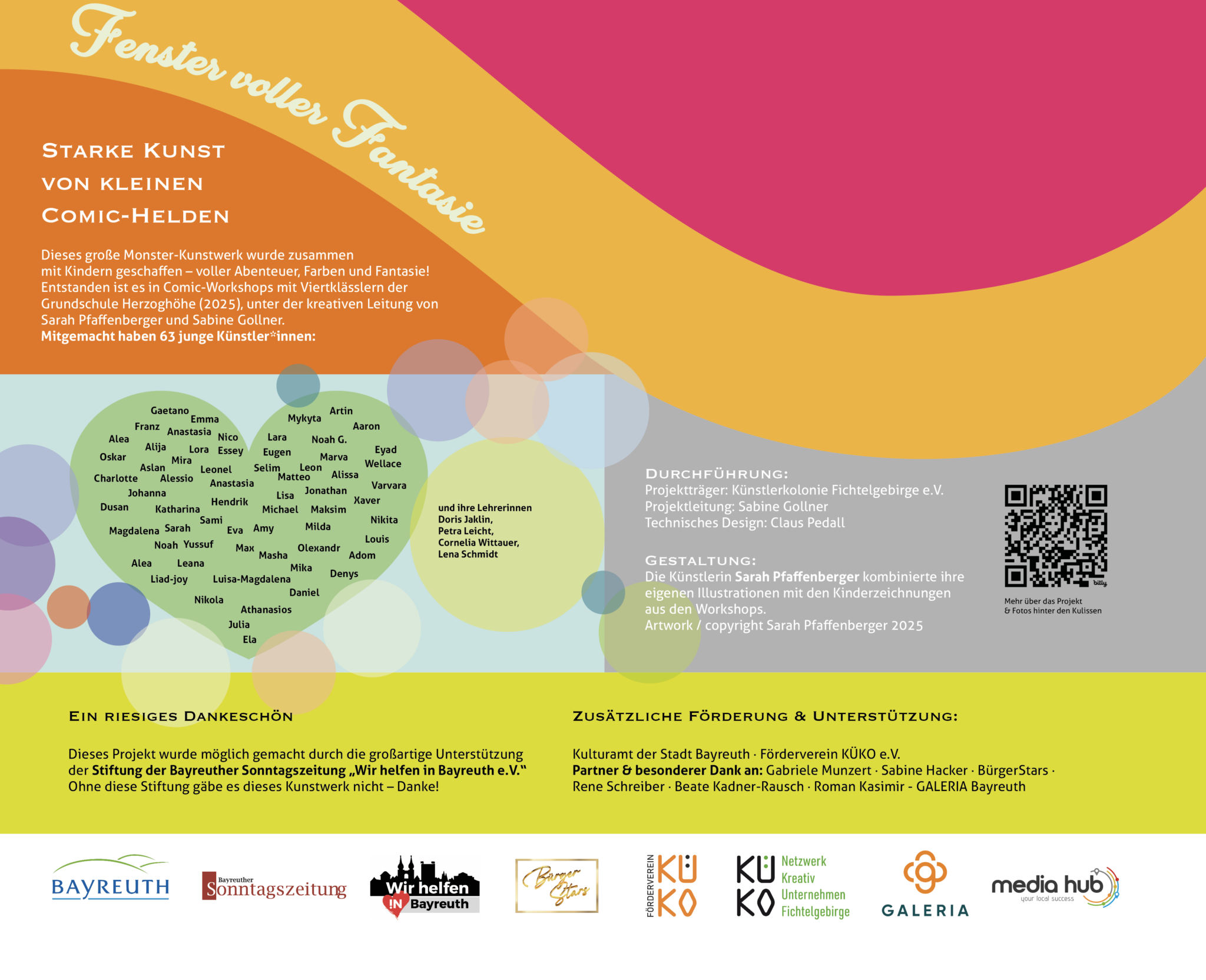 Unter der künstlerischen Leitung von Sarah Pfaffenberger und Sabine Gollner lernten die Kinder in Comic-Workshops, wie Figuren, Geschichten und Emotionen auf Papier zum Leben erwachen. Aus ihren vielen Zeichnungen, Ideen und Skizzen wuchs am Ende ein großes gemeinsames Kunstwerk – ein echtes Team-Monster aus Farbe, Spaß und Vorstellungskraft!