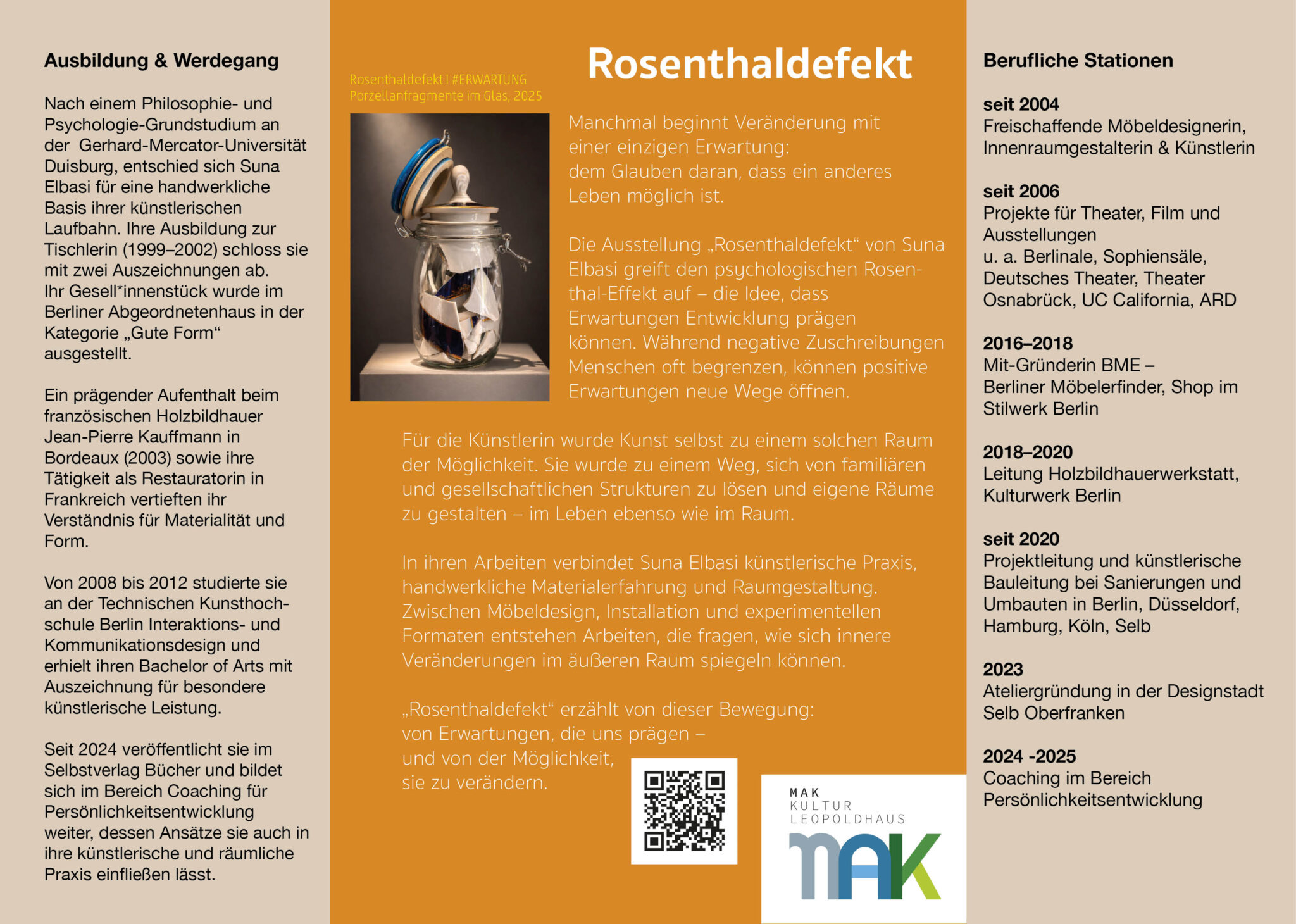 Der Titel der Ausstellung „Rosenthaldefekt“ bezieht sich auf den sogenannten Rosenthal-Effekt aus der Psychologie: Die Erwartungen, die wir an uns selbst oder an andere stellen, können Entwicklung maßgeblich beeinflussen. Positive Erwartungen eröffnen Möglichkeiten, während negative Zuschreibungen Menschen oft in engen Rollen festhalten. Und implementiert einen Augenzwinkernden Verweis auf Philip Rosenthal und dessen Prägung der Stadt aus der Ihre Mutter stammte.