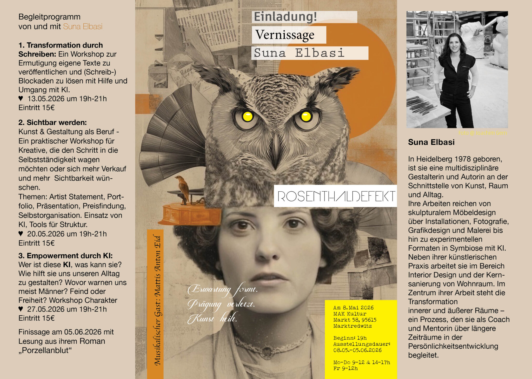 Mit der Ausstellung im MAK Kultur Leopoldhaus in Marktredwitz zeigt die multidisziplinäre Künstlerin und Gestalterin Suna Elbasi eine künstlerische Position, die Kunst, Raum, Material und persönliche Transformation in einem vielschichtigen Werkzusammenhang verbindet.